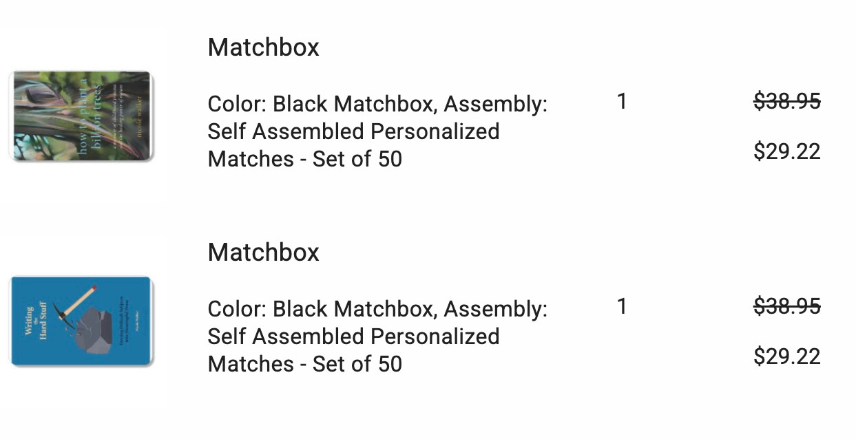 43. Order matchbooks with the cover of A Billion Trees. Stuff some of them with pinenuts. Some with amaranth. Leave most matches to distribute at book events.